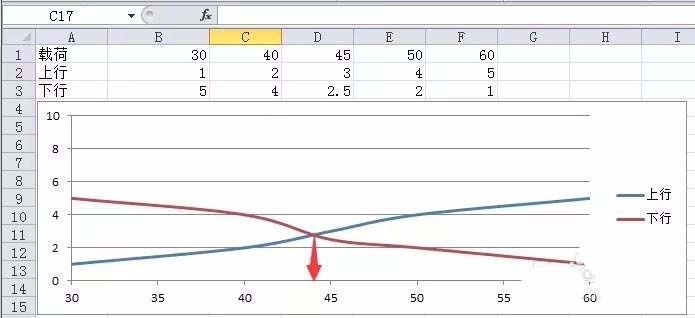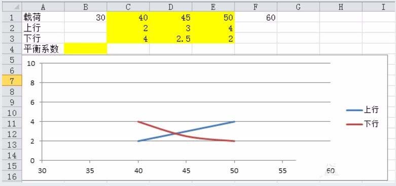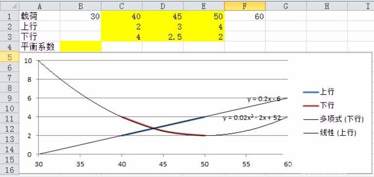 1、电梯运行时有不同载重的电流曲线,电流值为Y轴,载重比为X轴,电梯上行时30%、40%、45%、50%、60%载重的电流生成一条曲线,电梯下行时30%、40%、45%、50%、60%载重的电流生成一条曲线,然后两条曲线会有一个交点,需在Excel单元格内计算该成交点的X轴值。如图:计算交点的x轴的值。