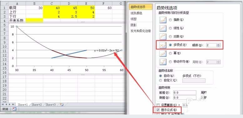 5、同理,给另外一条线也添加多项式的趋势性,并显示公式