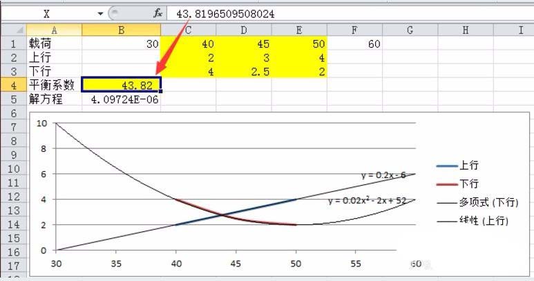 6、此时,能得到一个方程组:y = 0.2x - 6……(1)y = 0.02x^2 - 2x + 52……(2)用excel对方程组(1)(2)求解,即可计算出拟合曲线的交点位置,也就是“平衡系数”。