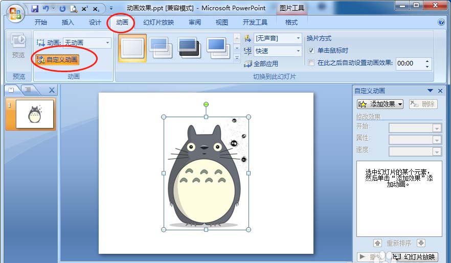 4、点击图片之后,在上方工具栏上点击“动画”然后选择“自定义动画”