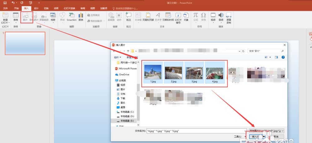 2、在插入菜单中执行插入图片命令,弹出插入图片选择窗口,在该窗口中将我们要插入的多张图片进行选中,然后点击插入将多张图片插入到幻灯片页中。