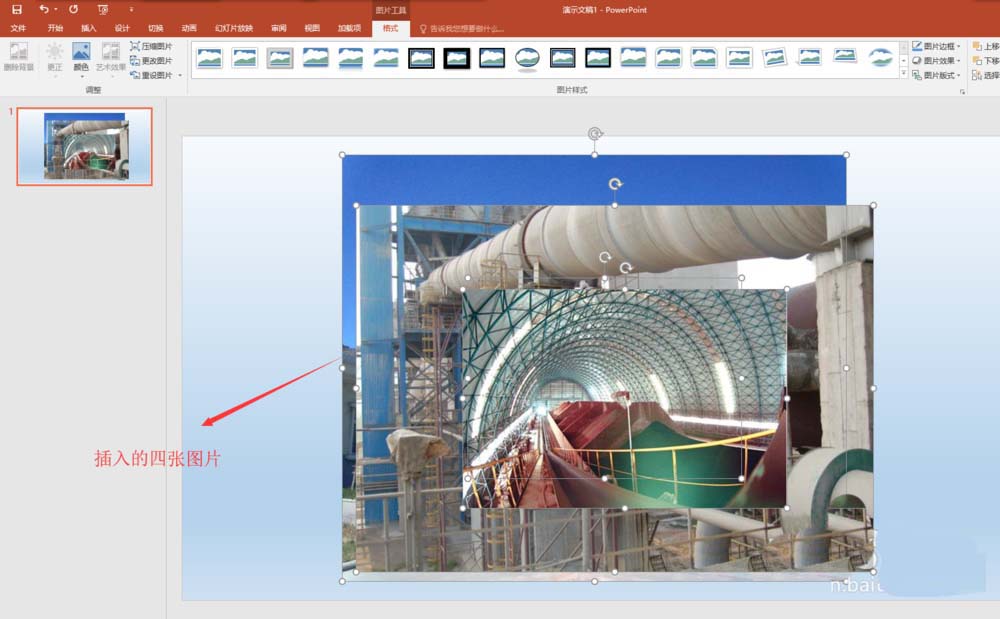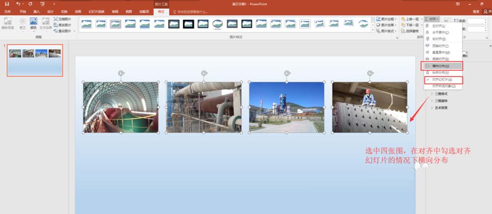 5、分别选中四张图片,将其移动位置,使其在水平方向上面先对齐;然后同时选中四张图片,执行格式中对齐命令,先勾选“对齐幻灯片”,然后在单击执行横向对齐。
