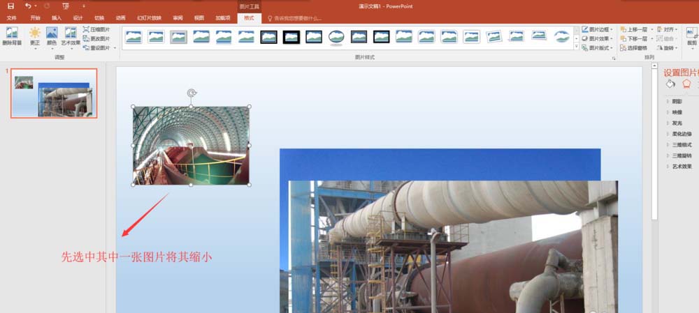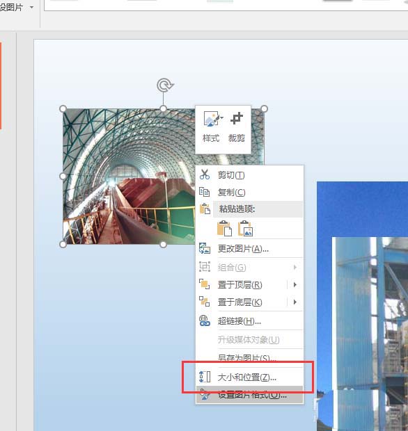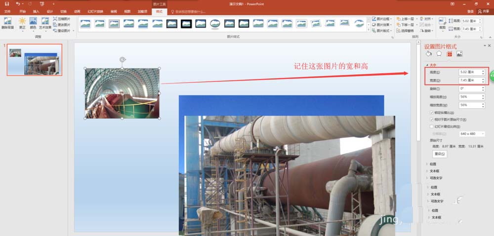 3、先选中其中的一张图片,通过图片四周的控制点将其缩小到合适大小,然后右键缩小的图片,执行查看大小和位置命令,然后在打开的设置图片格式中将该缩小后的图片大小的宽度与高度的数值记录下来。