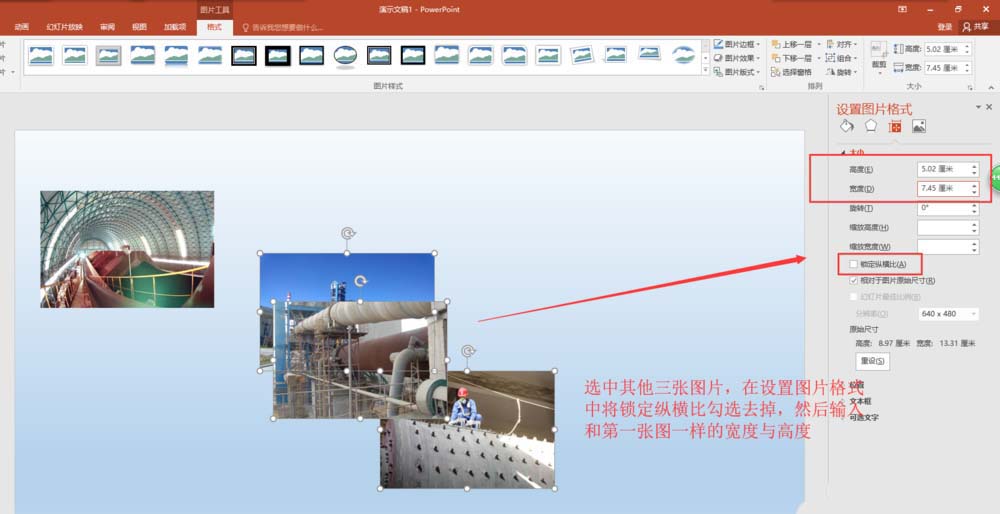 4、拖动鼠标用鼠标框选的方法将剩余的三张图片同时进行选中,然后在设置图片格式窗口中,先将“锁定纵横比”的勾选去掉,然后在宽度与高度的数值输入框中输入上一张缩小的图片的宽度与高度。
