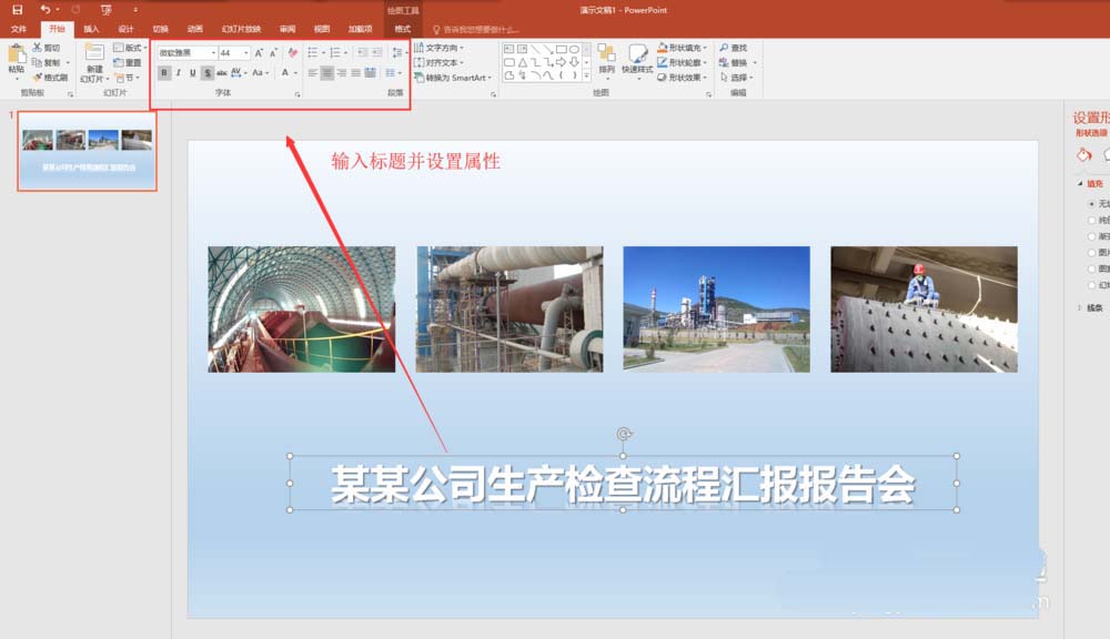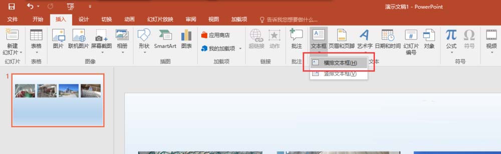 6、在插入菜单中的插入文本框命令中找到横排文本框,然后在幻灯片的下半位置上插入一个文本框,在文本框中输入PPT的标题,并设置标题的属性。这样一个多图型的常规PPT封面页就制作完成了,当然你还可以进一步的加logo和修饰,使封面页更美观。