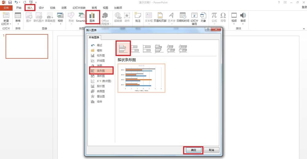 1、首先打开PPT2013——点击插入——图表——选择条形图——选择条形图样式,有簇状、堆积、百分比等条形图(相应的还有三维的条形图)——点击确定,就可以打开条形图了。