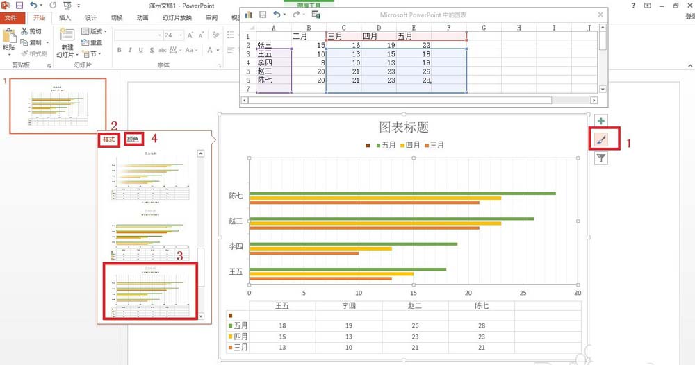 6、更改图表的样式和配色方案:点击条形图——在右上角点击毛笔图标——点击样式,然后选择一种样式——再点击颜色并选择一种合适的颜色就可以了。