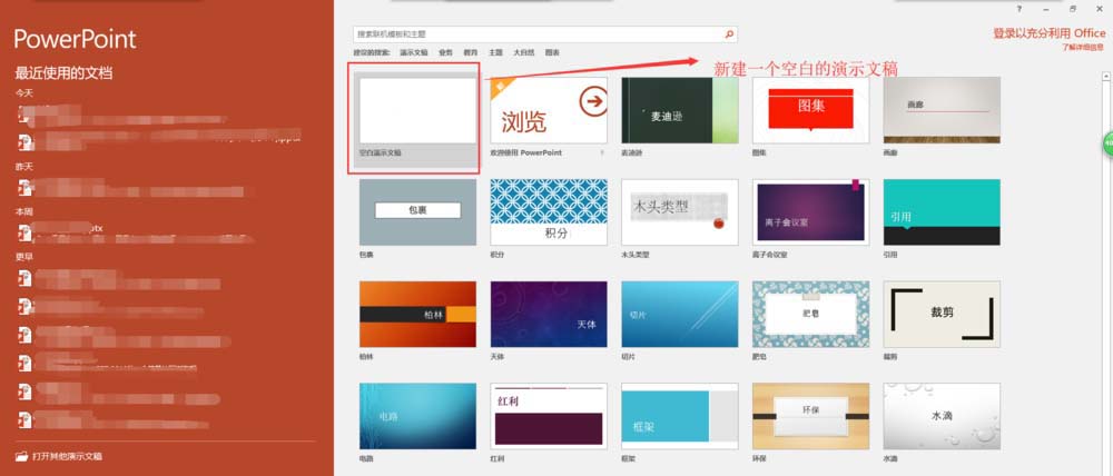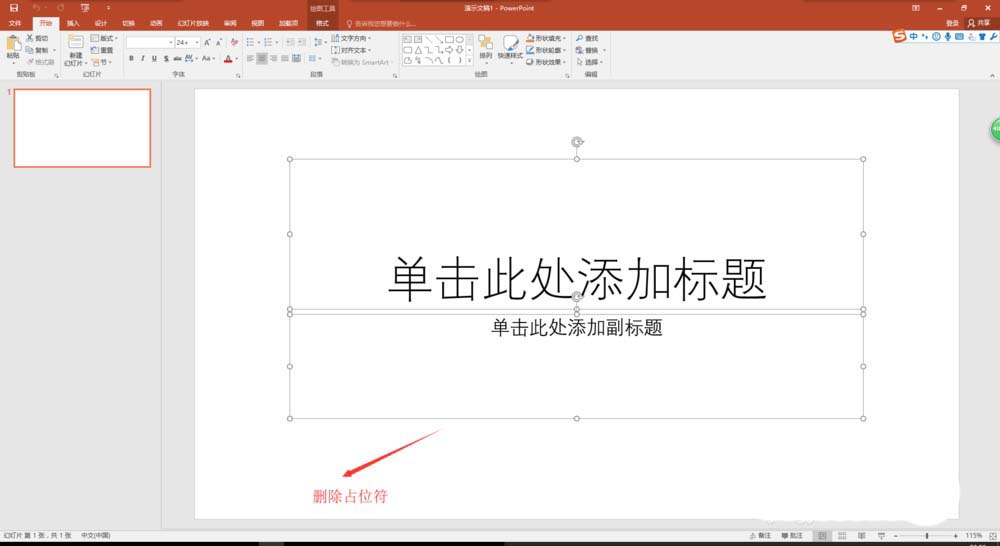 1、打开PPT 2016软件,点击“空白演示文稿”命令,新建一个空白的PPT 2016演示文稿,在新建的演示文稿中框选中默认的两个占位符,按delete键将其删除。