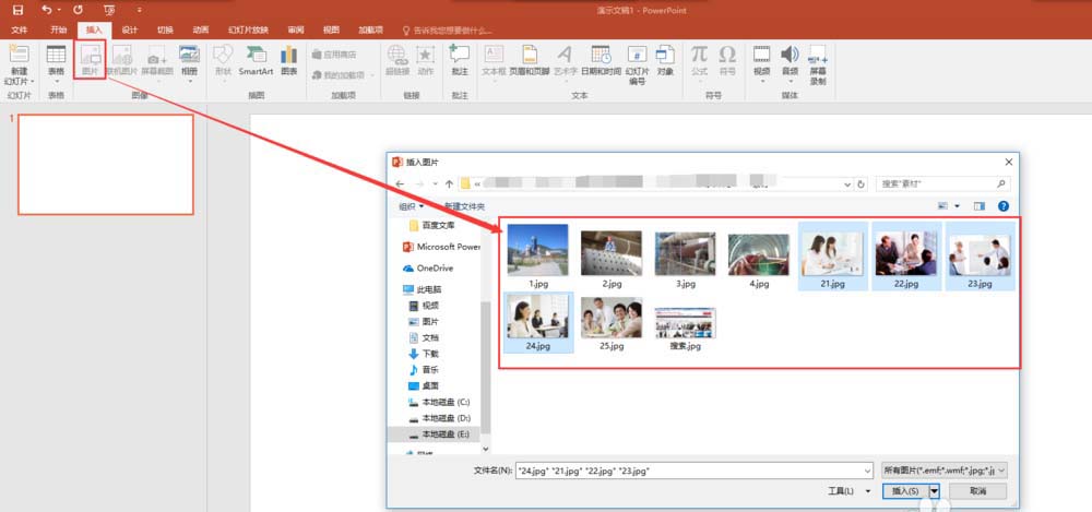 2、选择插入菜单,在插入菜单的命令中找到插入图片命令,然后会弹出“插入图片”窗口,在插入图片窗口找到图片素材存放的位置,然后选中四张图片素材,点击插入到幻灯片页中。
