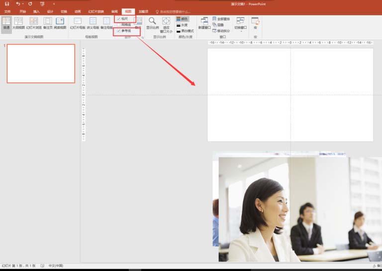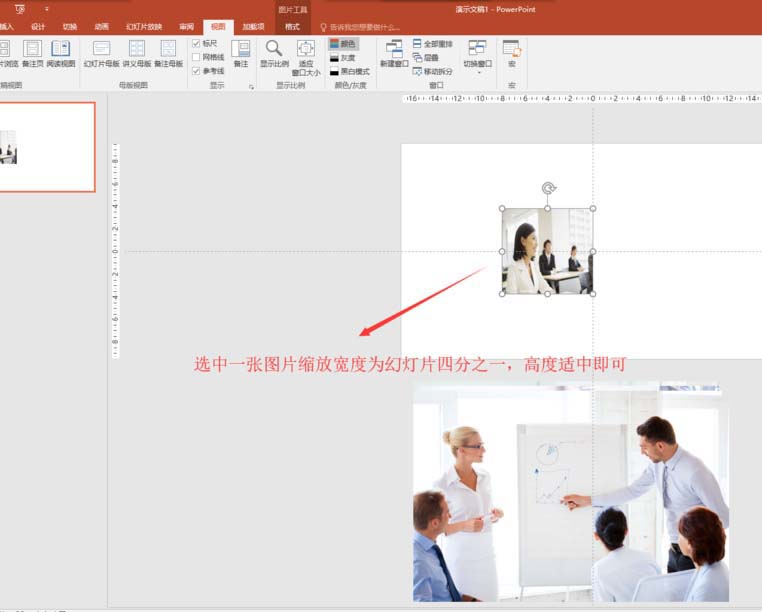 3、缩小幻灯片演示比例,将四张图片素材移到幻灯片外面,然后切换到“视图”窗口,在视图窗口中将标尺与参考线勾选出来;然后选中一张图片素材,调整其大小,将其宽度缩小到幻灯片页四分之一大小,宽度调整到适中即可。