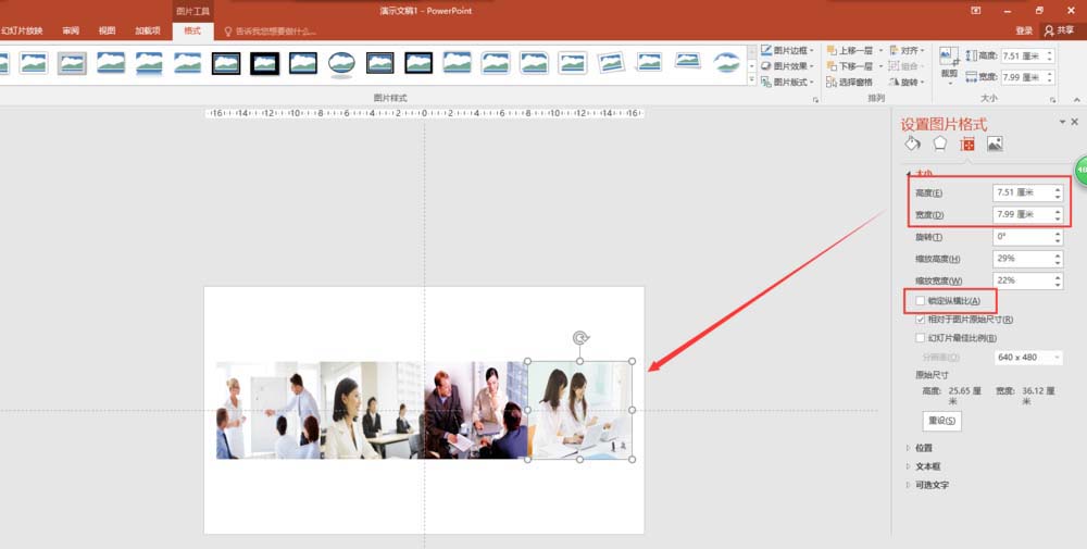 4、然后打开设置图片格式窗口,依次选中剩余的三张图片,在设置图片格式窗口中选择大小设置,将“锁定纵横比”的勾选去掉,然后将这三张图片的大小设置为最开始一张的大小一样,并将他们移动排列在一起。