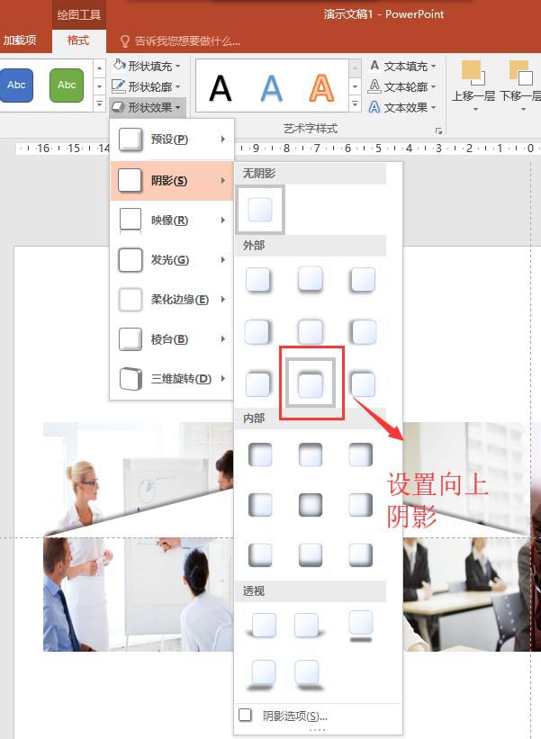 6、选中这个等腰三角形,在格式菜单中设置这个等腰三角形的形状填充为白色,形状轮廓为无;然后为这个等腰三角形设置形状效果为外部向上阴影,最后将这个等腰三角形移到图片下方。