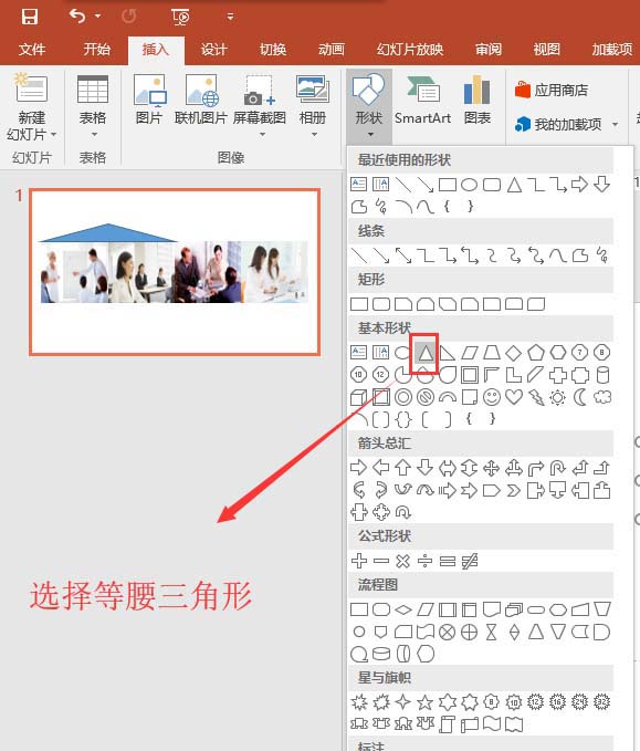 5、切换到插入菜单,在插入菜单中找到形状命令中的等腰三角形,然后在鼠标在幻灯片中绘制出一个等腰三角形出来,要求等腰三角形的底长度为两张图片的宽度,等腰三角形的高度适中即可。