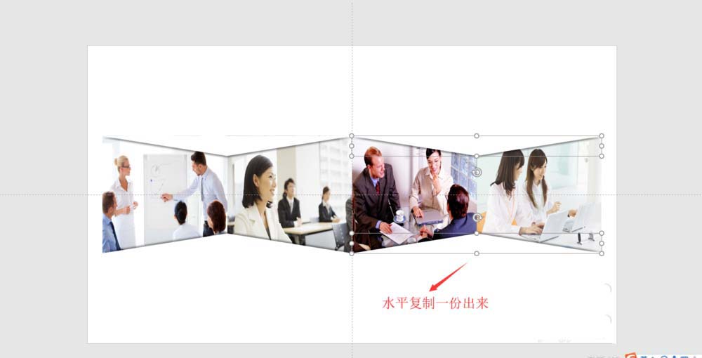 8、选中左侧图片的两个等腰三角形,按住辅助键Ctrl键与shift键,然后水平复制出另外两个等腰三角形出来,将其放在右侧图片上;在视图窗口中将标尺与参考线去掉,这样一个伪立体的折页效果就制作完成了,是不是非常的简单。