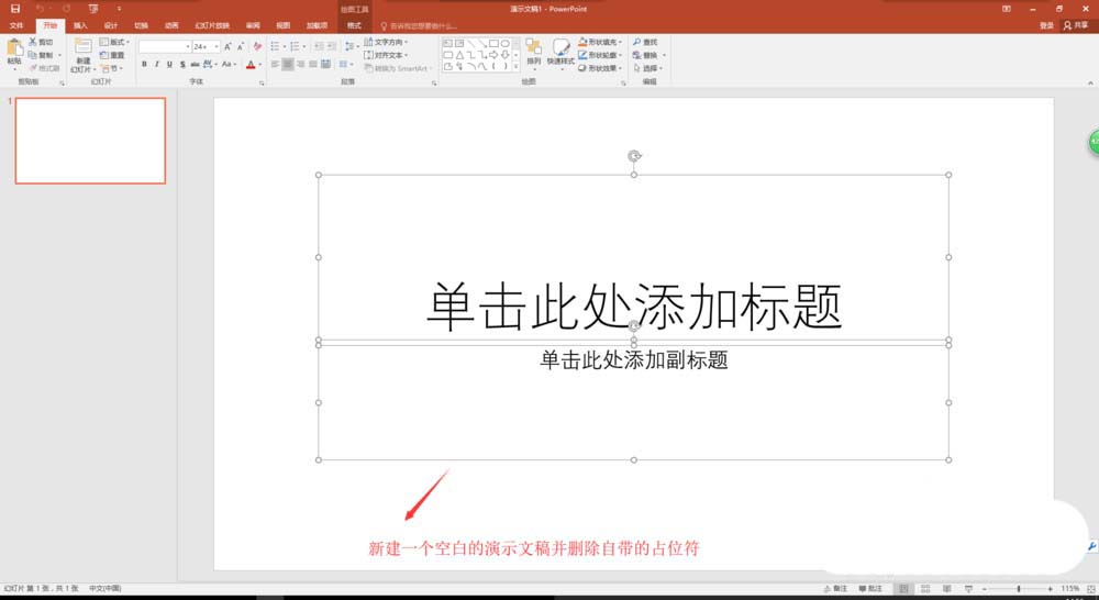 1、找到并打开PPT演示文稿软件,新建一个空白的演示文稿,在新建的演示文稿中,拖动鼠标将默认的两个占位符框进行选中,按键盘上delete删除键将其删除。