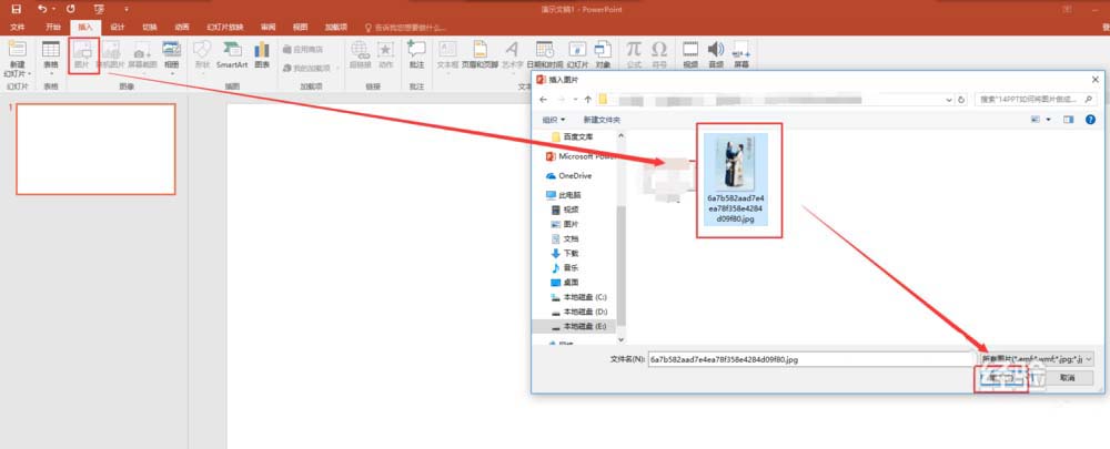 2、选择插入菜单,在插入菜单中找到图片命令,单击图片选择插入一个图片,在弹出的插入图片窗口中选择我们要做处理的图片素材,点击插入,将这个待处理的图片素材插入到幻灯片页中。