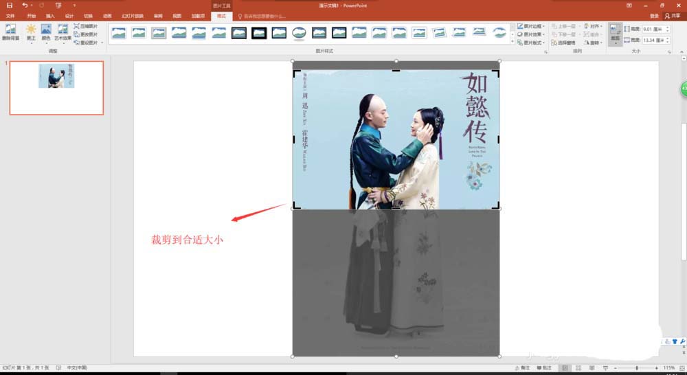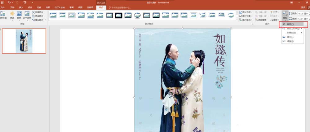 3、将图片素材插入到幻灯片页中之后,我们发现插入的图片过大,所以选中图片,切换到格式菜单中,在格式菜单中找到裁剪命令。