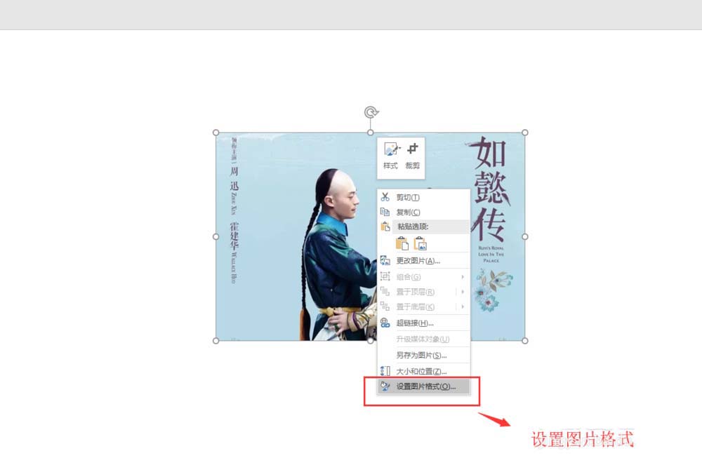 5、选中裁剪后的图片,右键鼠标,在弹出的右键下拉菜单中,选择设置图片格式命令,会在幻灯片页的右侧出现一个设置图片格式窗口。