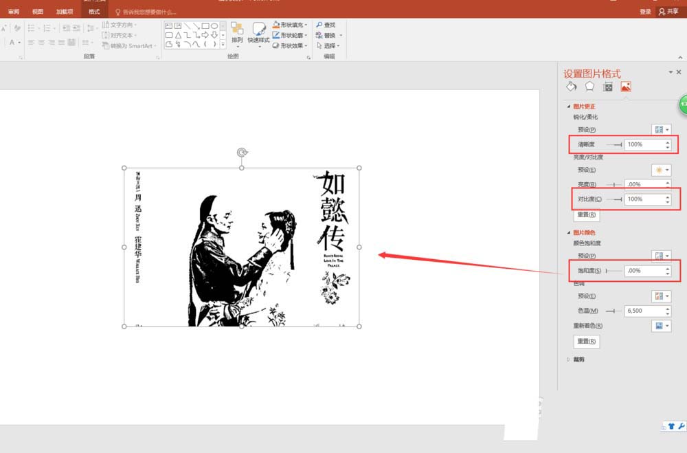 6、在右侧的设置图片格式窗口中,切换到图片更正选项,在图片更正中设置图片素材的清晰度与对比度的数值都为100%;在设置图片颜色饱和度为100%,这样一个版画的效果已经基本出现了。