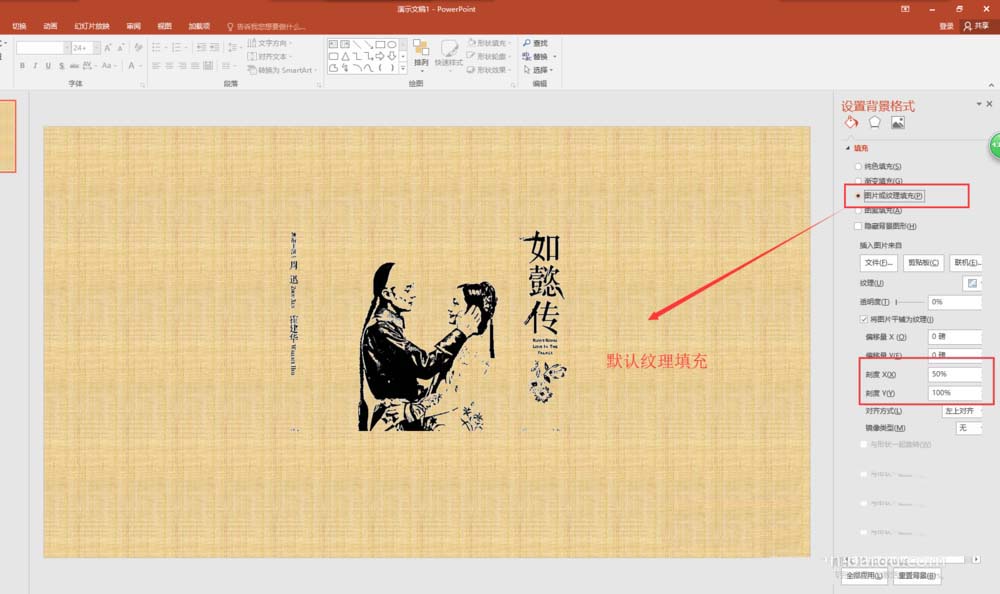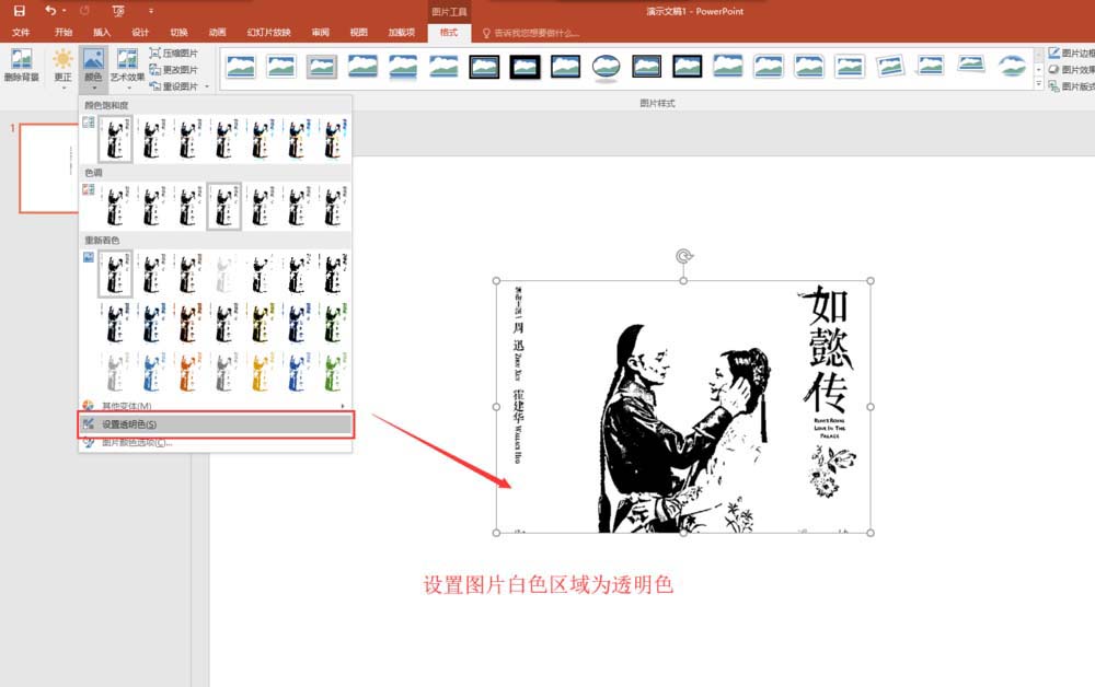 7、在找到格式中的颜色命令,在颜色中选择设置透明色,然后将素材图片的背景白色区域设置为透明色,这样图片的背景就是透明的了,然后在为图片设置一个背景填充,选择默认的图片或纹理填充效果即可,可以在调整一下刻度的数值。这样,我们就在PPT中将一个图片处理成版画效果了。