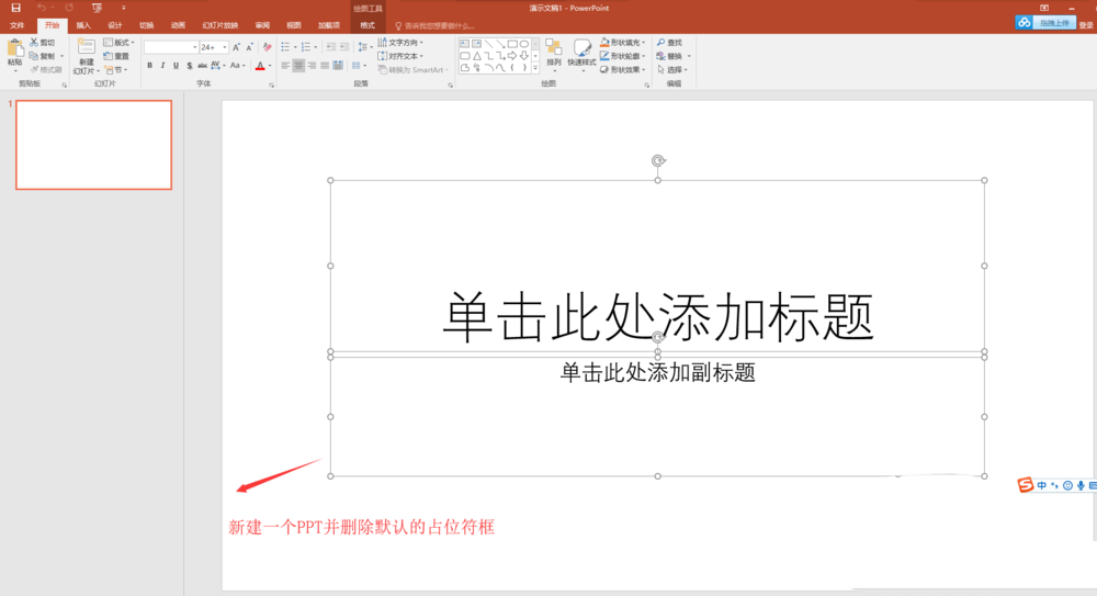 1、先新建一个PPT演示文稿,新建的演示文稿会默认自带有两个主副标题的占位符框,用鼠标框选,选中这两个自带的占位符框,按键盘上的删除键delete键将其删除。