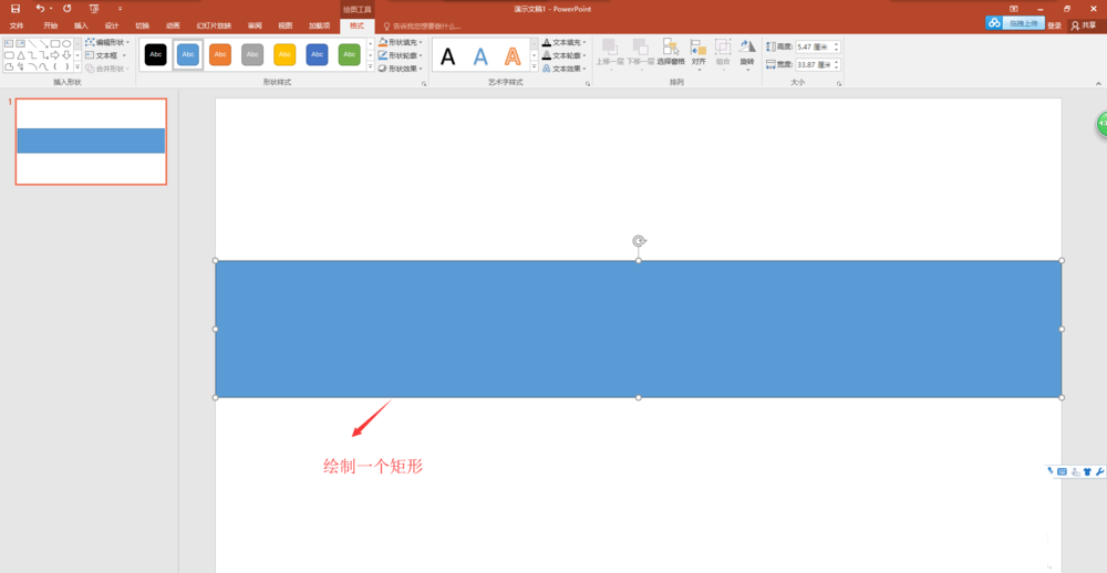 2、选择插入菜单中的形状命令,在形状中选择矩形,然后在空白的幻灯片页中的中间位置绘制一个宽度与幻灯片一样宽,高度适中的矩形出来。