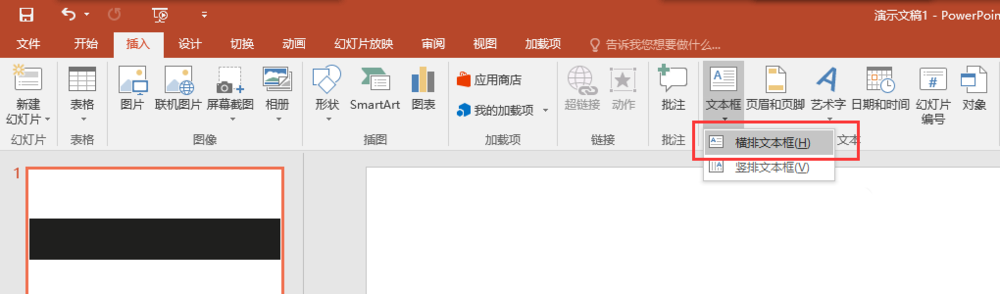 4、然后在切换为插入菜单栏中,在插入菜单中找到文本框命令,在文本框命令中选择横排文本框命令,然后在幻灯片的空白位置上插入一个横排文本框。