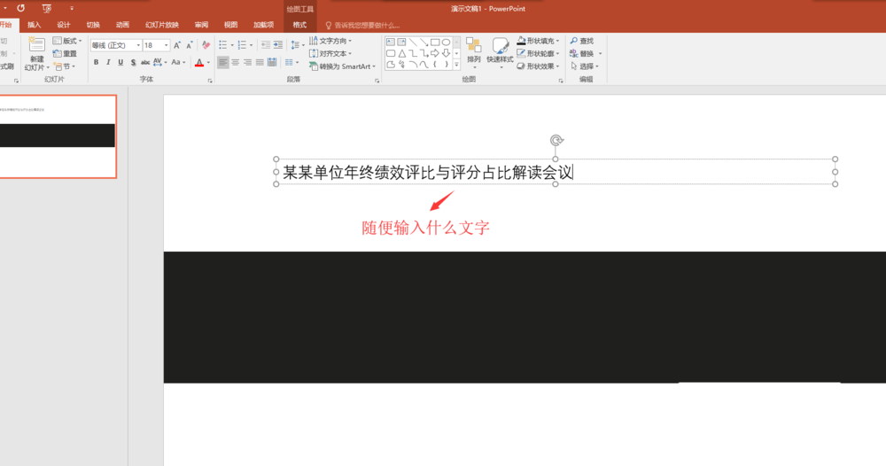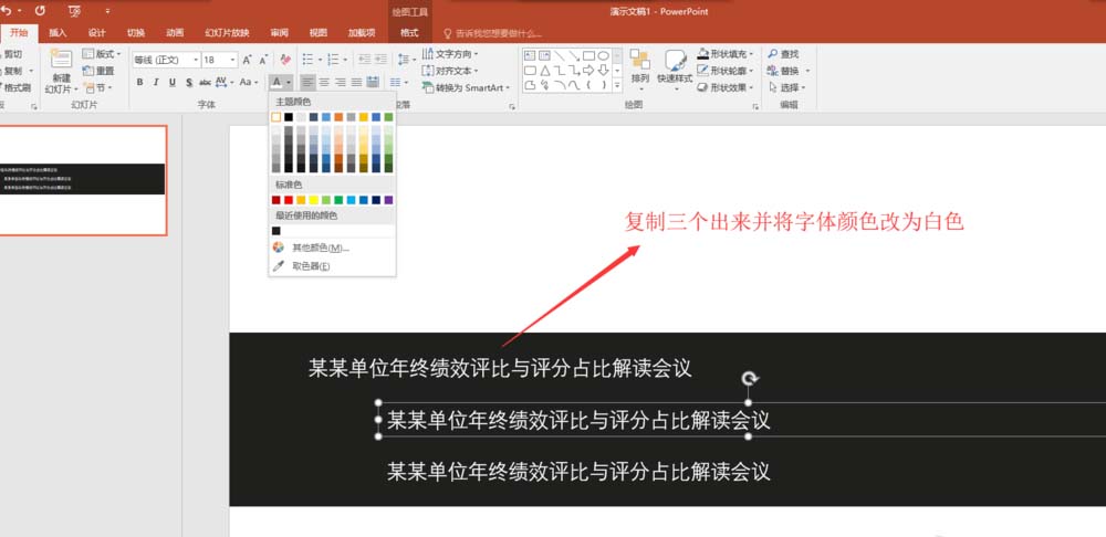 5、在插入的横排文本框中输入你要输入的标题内容,这里我是随便输的,选中这个文本框,按住辅助键Ctrl键复制出两个出来,依次选中这三个文本框,将文本框中的文本内容颜色改为白色,在分别将这三个文本框中的多余的文本内容依次删掉。