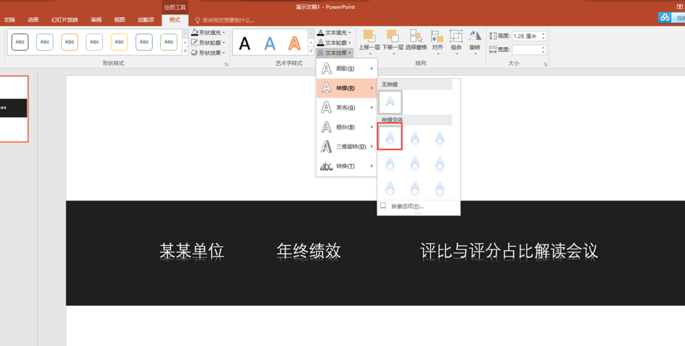 6、首先将文本要移到矩形上并放好位置,用鼠标框选的办法,将三个文本框全部选中,然后在格式菜单中选择对齐命令,单击顶端对齐与横向分布;为文本添加文字效果中的映像,在映像中选择“紧密映像,接触”这个效果。