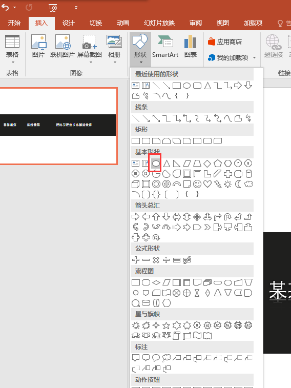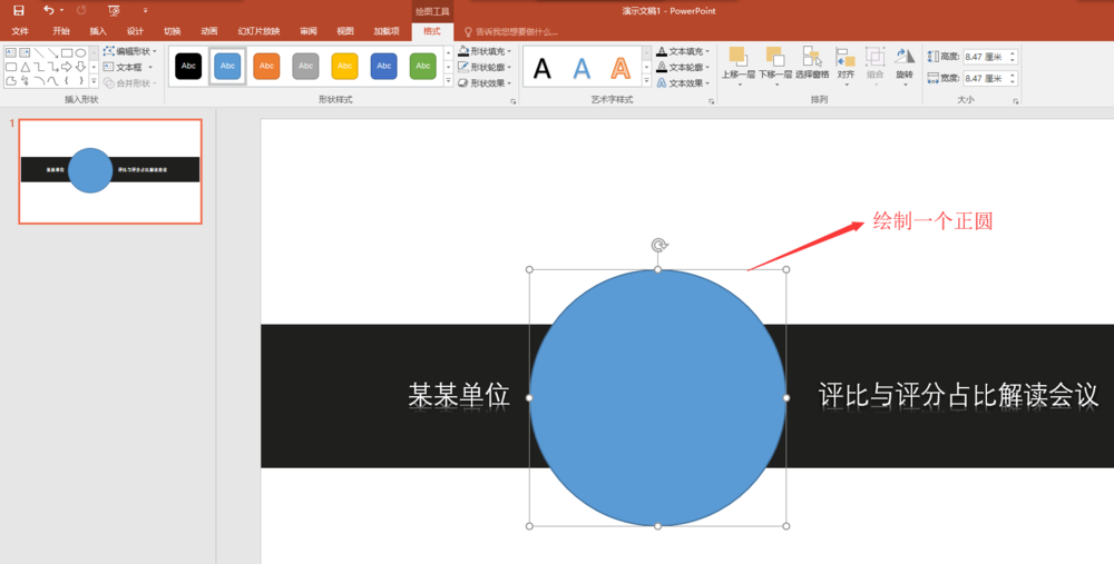 7、在选择插入菜单,找到椭圆工具,在结合键盘上的shift键辅助键,在幻灯片中画出一个大小合适的正圆出来;将正圆移动到第二个文本框上面,将第二个文本框的内容作为我们要制作伪放大镜效果的文字。