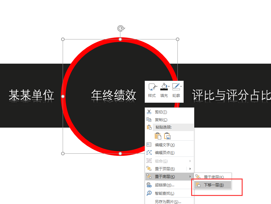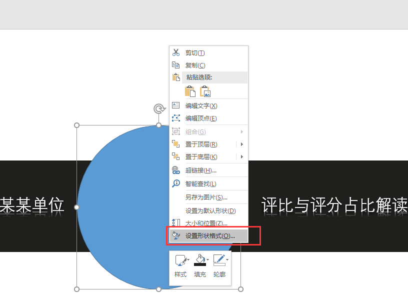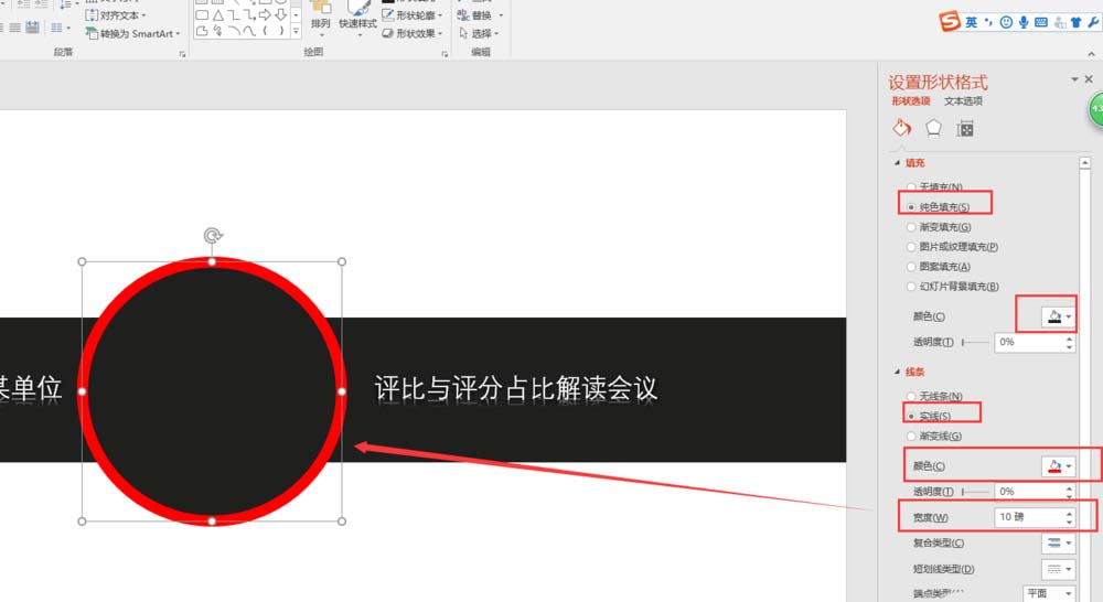 8、选中绘制的正圆,右键鼠标选择设置形状格式命令,在右侧弹出的设置形状格式窗口中,先设置填充效果为纯色填充,颜色为矩形的填充颜色一致;在设置线条为红色的实现,设置线条的宽度为10磅。