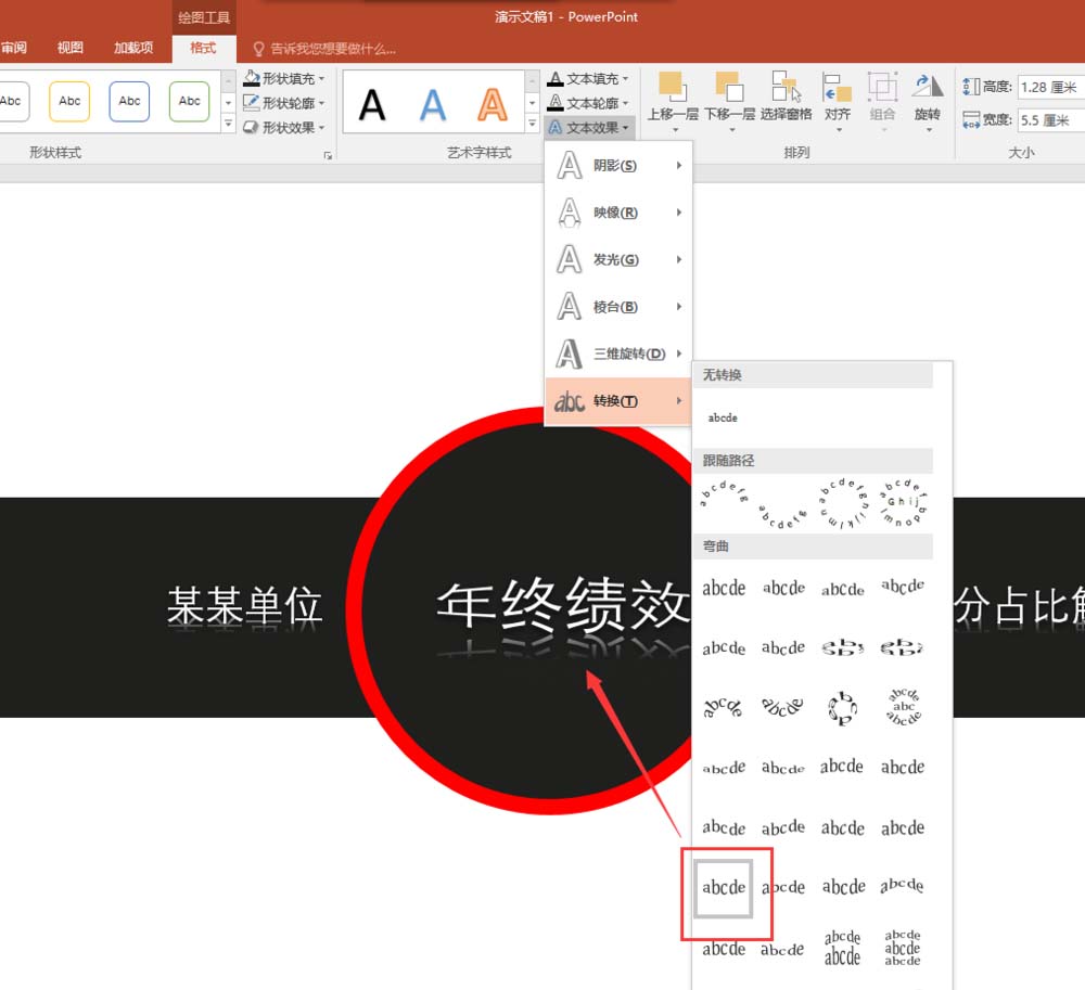 9、选中设置好的正圆,右键选择置于底层中的下移一层,这样下方的文本框内容就能进行显示了;选中显示的文本框,执行格式菜单文本效果中的转换效果中的“腰鼓”效果。这样一个好像被放大镜显示的文字效果就出现了;我们在将所有文字在调整一下文字大小,最终就完成了伪放大镜突出标题文字的效果了。
