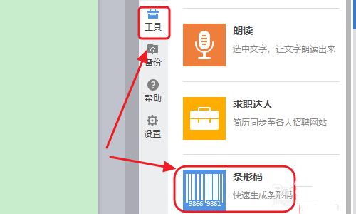 3、点击此按钮,就可以在软件的右侧展开一个窗口,在该窗口中点击“工具”即可看到条形码工具选项了;
