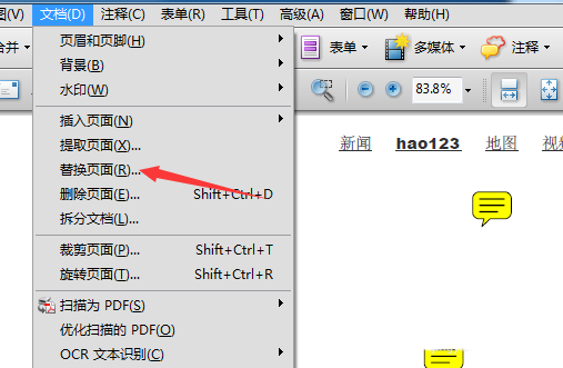 3、点击了文档的菜单之后,弹出了下拉菜单选中为 替换页面 的选项。