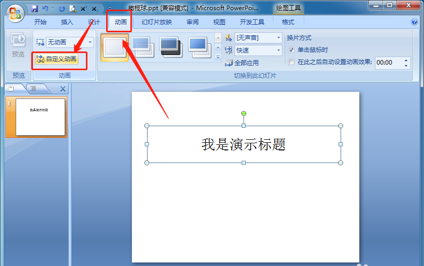 4、点击文本然后在上方工具栏上点击“动画”->“自定义动画”
