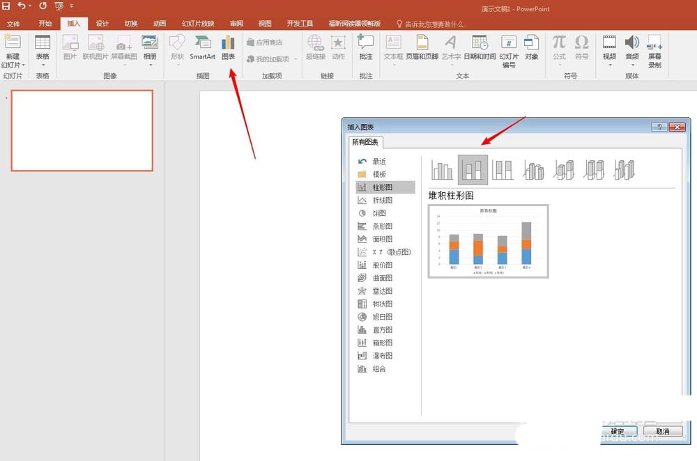 1、建立PPT文档,点击“插入”—“图表”—“柱形图”—“堆积柱形图”。