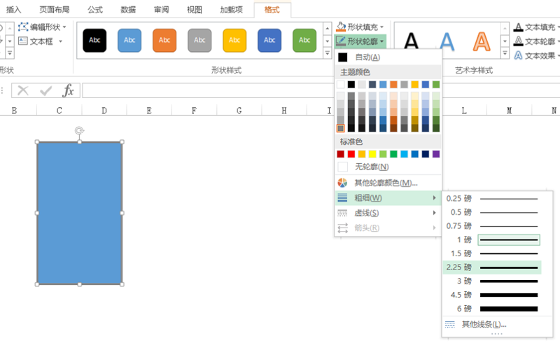 3、选择矩形,设置形状轮廓为灰色,粗细为2.25磅。