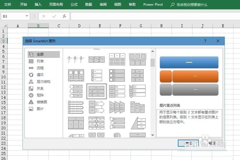 2、在弹出的SmartArt图形选择对话框中,选择右侧的“图片重点列表”按钮,然后,点击“确认”按钮