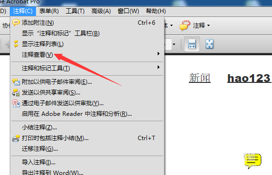 3、点击了Adobe Acrobat的注释的菜单之后,弹出了下拉菜单选中为注释查看的选项。