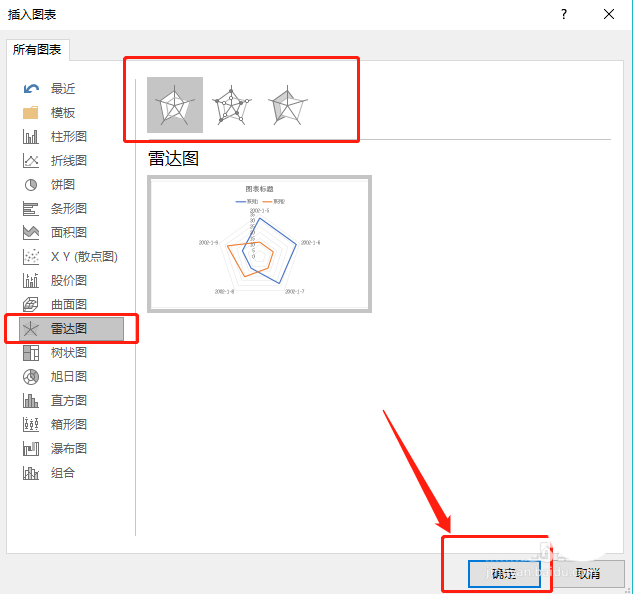 4、在图表选项中选择【雷达图】并选择你需要的样式,点击确定