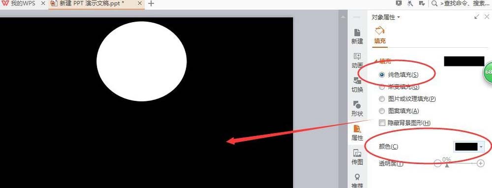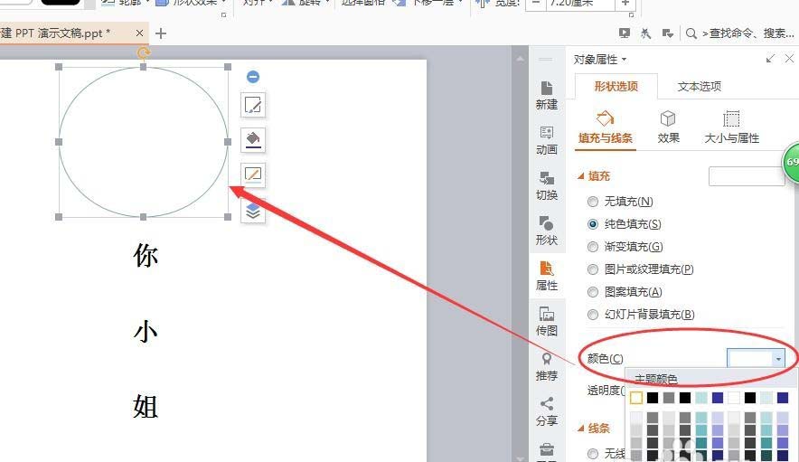 3、在设置这个形状的属性,填充成白色,选择无线条把这个圆形变成一个透明写圆形形状