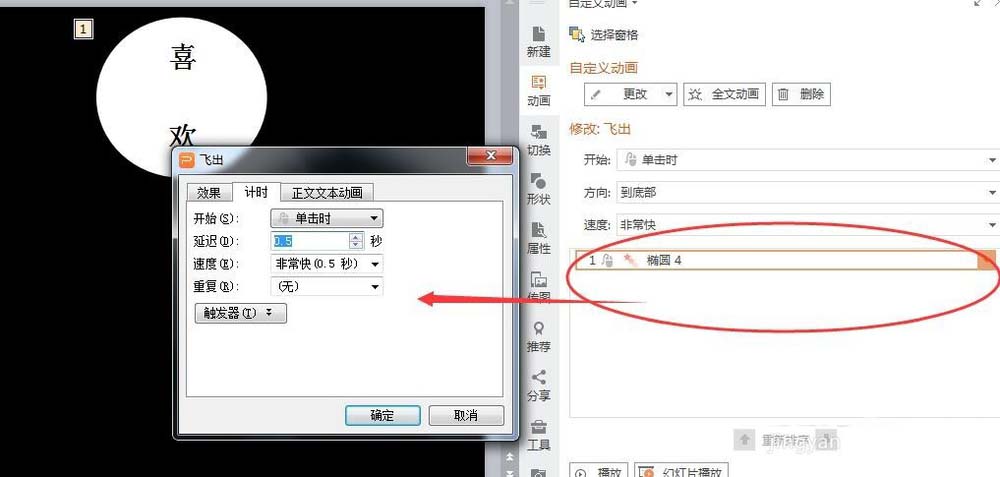 6、选中这个圆形,点击菜单栏自定义动画,设置一个动画效果,我们选择飞出效果,如图