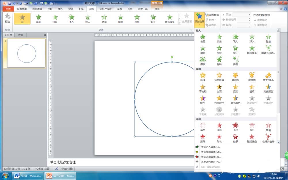 3、选中绘制的正圆,单击“动画”选项卡,在“高级动画”组中单击“添加动画”按钮。