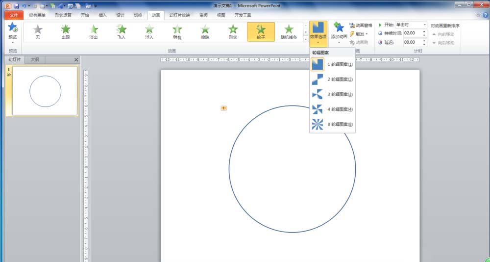 5、在“动画”组中单击“效果选项”,在下拉列表中选择“1轮辐图案(1)”.