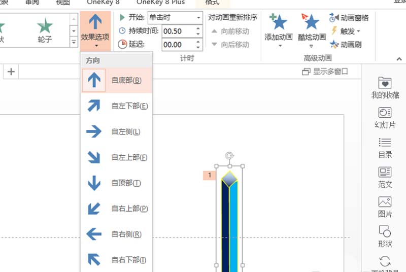 4、选择形状,执行动画-添加动画命令,选择飞入,设置效果选项为自底部。