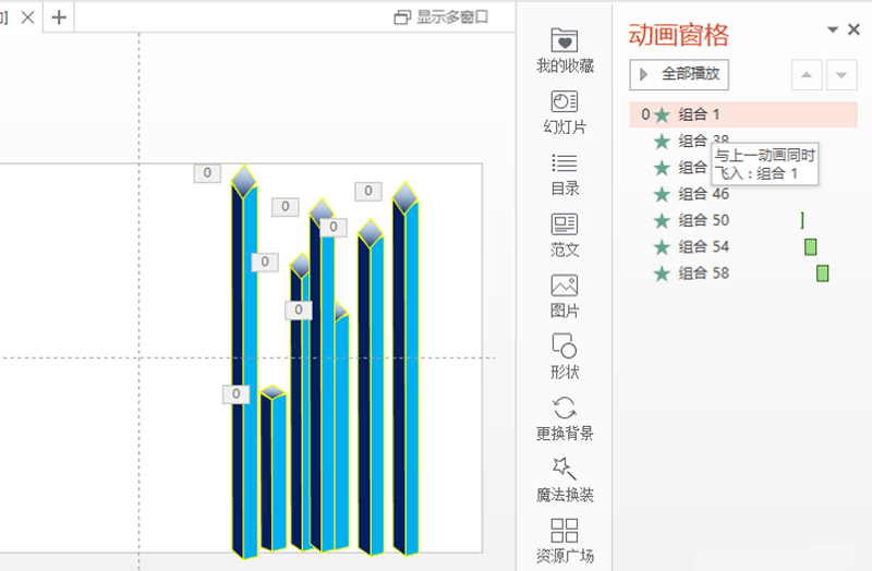 6、调出动画窗格,设置第一个动画开始为从一动画开始,其余的设置为从上一动画之后开始。