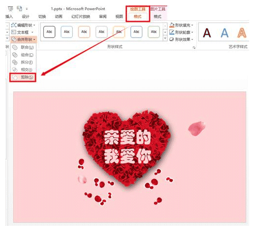 先选中形状,按住Shift键,再点击表白文本,在【格式】选项卡下找到【合并形状】-【剪除】,然后你就会发现字体镂空了(为了方便看出来,这里设置了粉色背景)