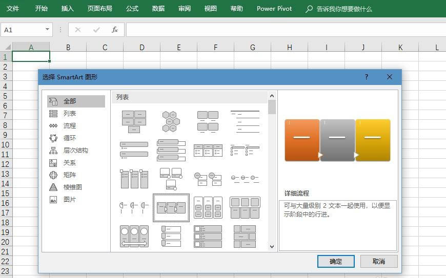 2、在弹出的SmartArt图形选择对话框中,选择右侧的“详细流程”按钮,然后,点击“确认”按钮。
