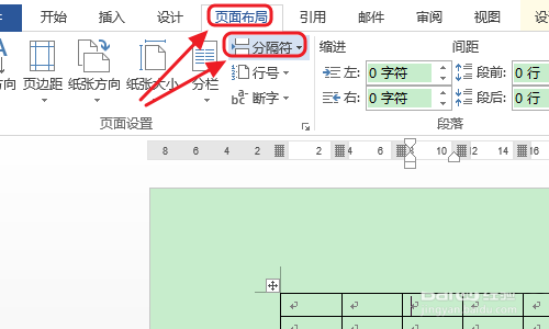 ①这次我们将光标定位在表格第一行的任意位置,然后点击工具栏“页面布局”-“分隔符”,如下图;