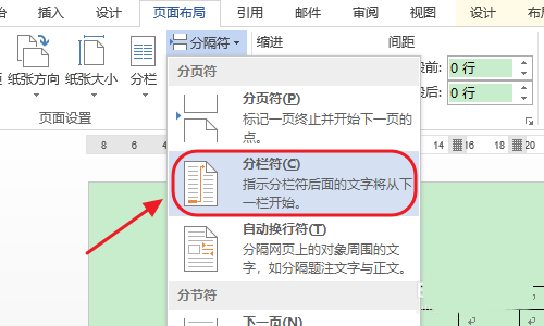 ②在分隔符右侧的三角形下拉菜单中,我们找到并且点击“分栏符”,此时同样可以达到我们的目的;